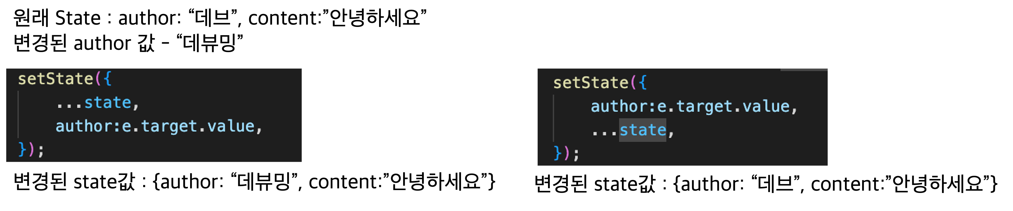 첫번째의 경우, 기존의 state 값으로 프로퍼티를 가져오고 author에 변경된 value를 대입하기 때문에 상태값이 정상적으로 변경된다.
