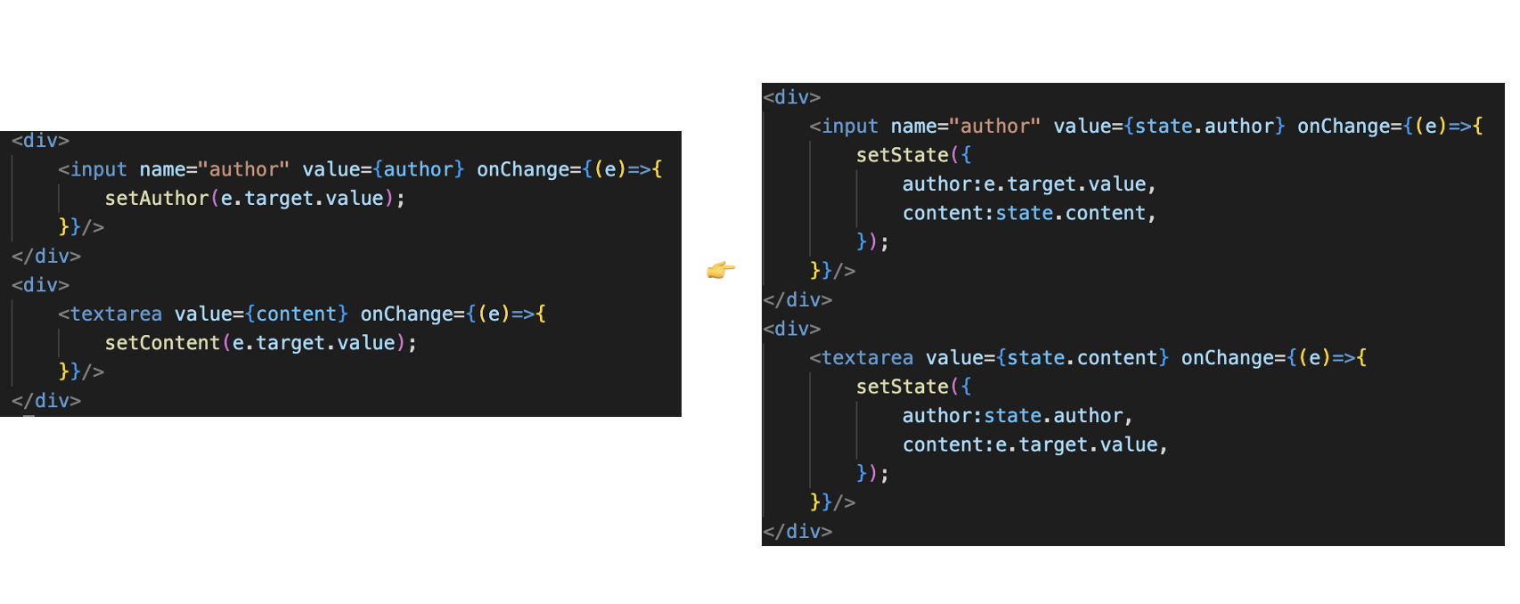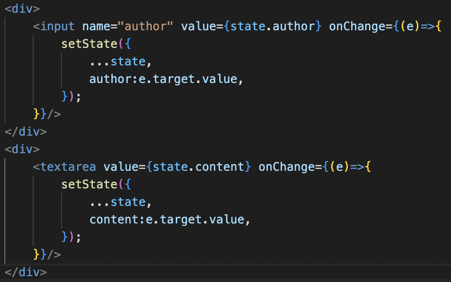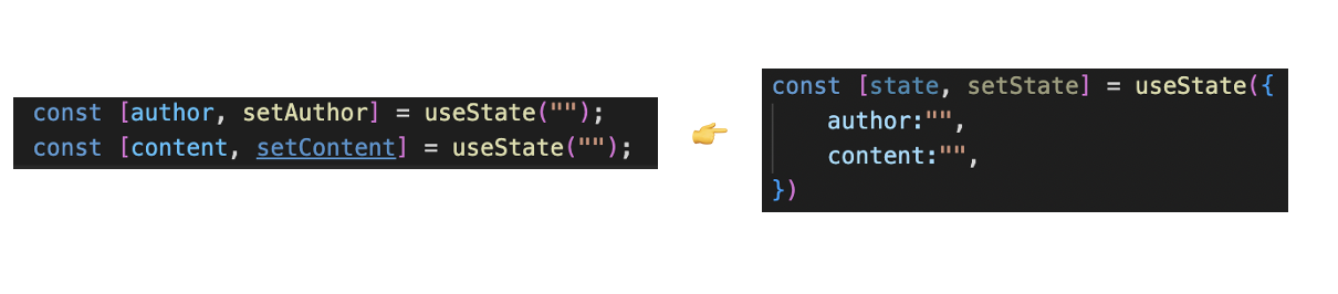 author와 content로 각각 선언되어있는 상태변수를 객체를 사용하여 하나의 상태변수로 통합할 수 있다.