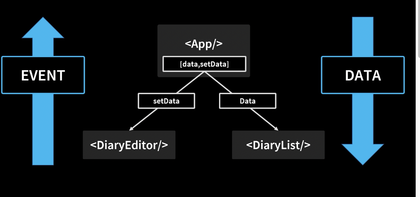Data는 위에서 아래로 흐르는 단반향 데이터 흐름이고, 추가, 삭제같은 Event는 함수를 Props로 전달해 아래에서 위로 올라가는 역방향 이벤트 흐름 구조를 보인다.