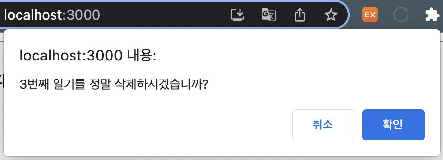 그럼 이런 확인 창이 뜨고, 확인 버튼을 누르면 onDelete 함수를 호출해 데이터를 삭제하게 된다.