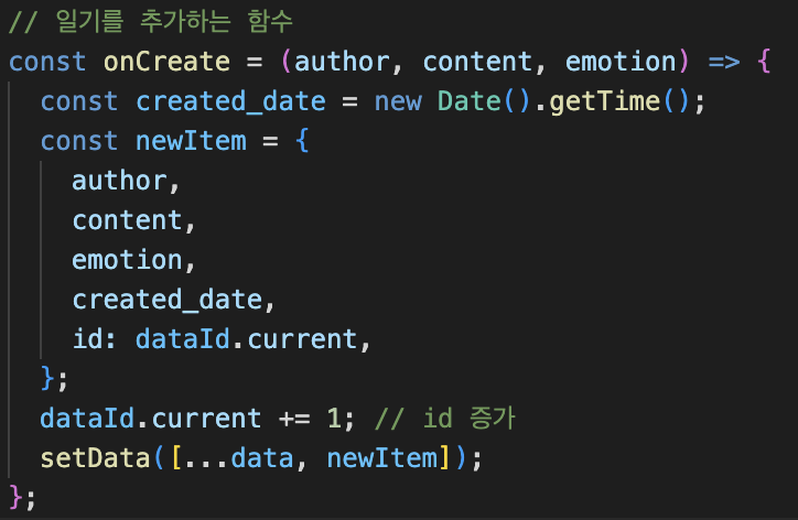 일기데이터를 생성할 때, 각 데이터의 고유한 id 값을 부여하기 위해 useRef로 별도로 관리해주고, 일기가 추가될 때마다 id 값을 증가시켜준다.