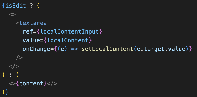 👉 이 값을 관리하면 삼항연산자 사용해서 isEdit에 따라 textarea와 수정취소/완료 버튼이 보이도록 화면 처리할 수 있다.
