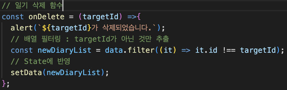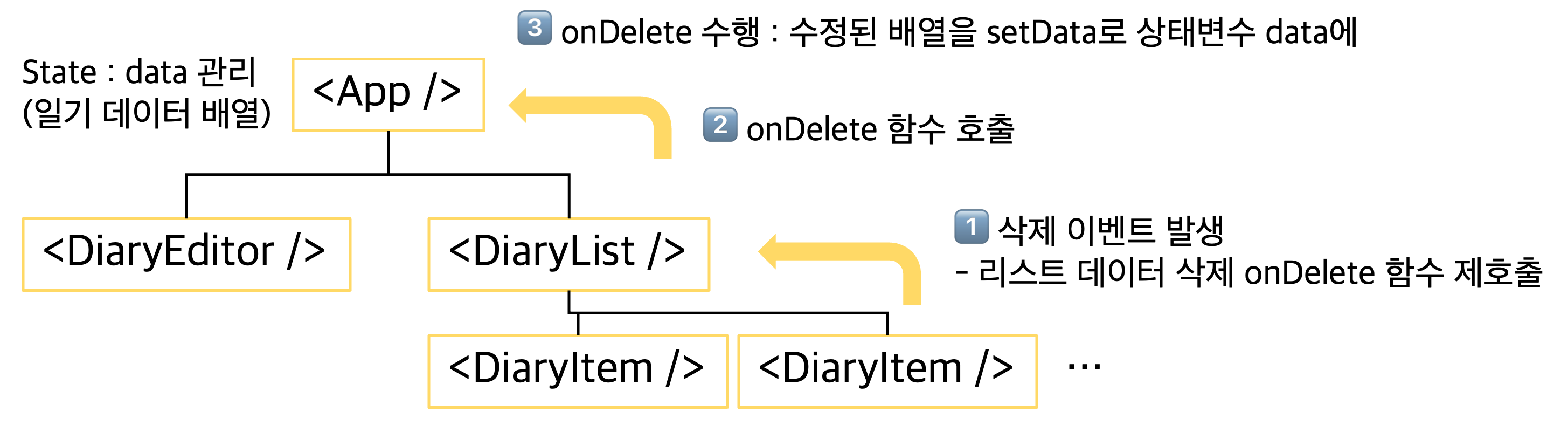 > DiaryItem의 '삭제하기' 버튼 onClick 이벤트에서 onDelete 함수 호출