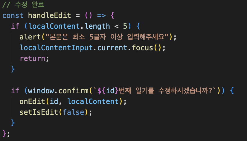 - textarea에 입력된 값이 바뀔 때마다 localContent를 갱신하고, 수정완료 버튼이 눌리면 localContent를 수정함수로 전달