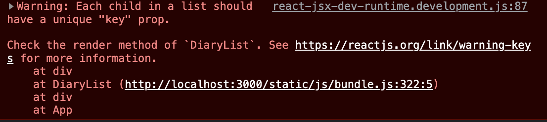 만든 리스트의 각각의 자식 요소들은 고유한 key Prop을 받아야 한다는 에러.