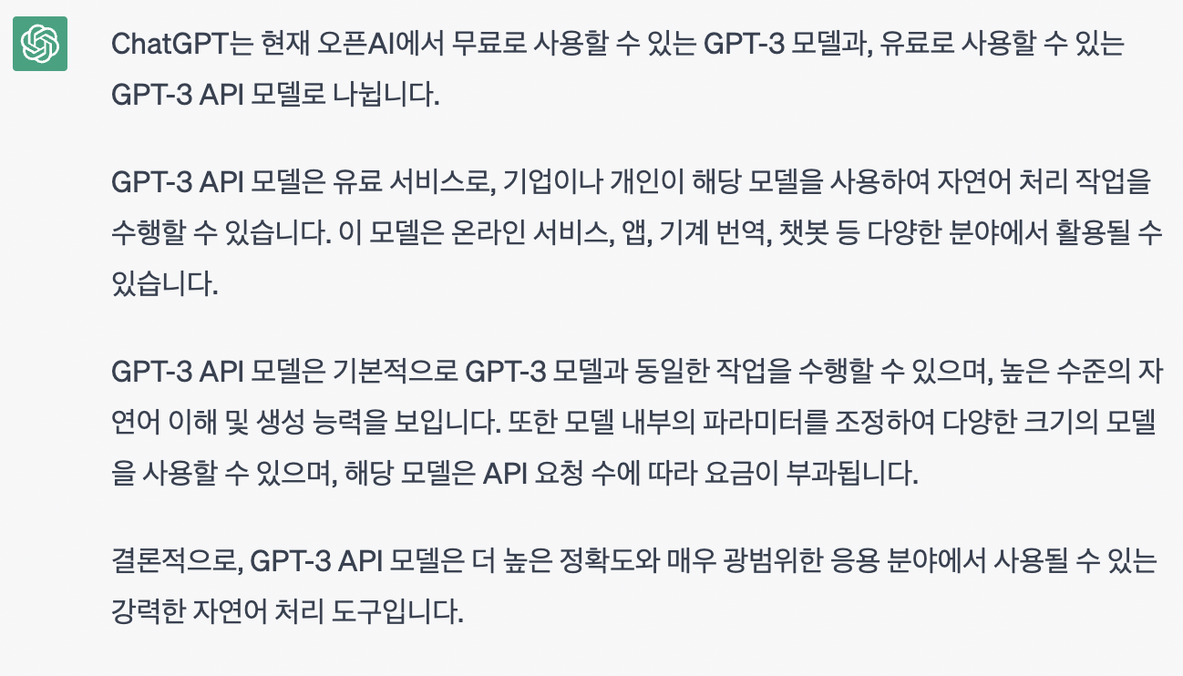 요약하면, ChatGPT는 대화형 인공지능 모델로서 자연어 처리 작업에 매우 유용한 모델 중 하나입니다.