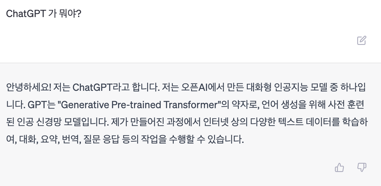ChatGPT는 오픈AI에서 개발한 대화형 인공지능 모델 중 하나로, 언어 생성을 위해 사전 훈련된 인공 신경망 모델입니다.