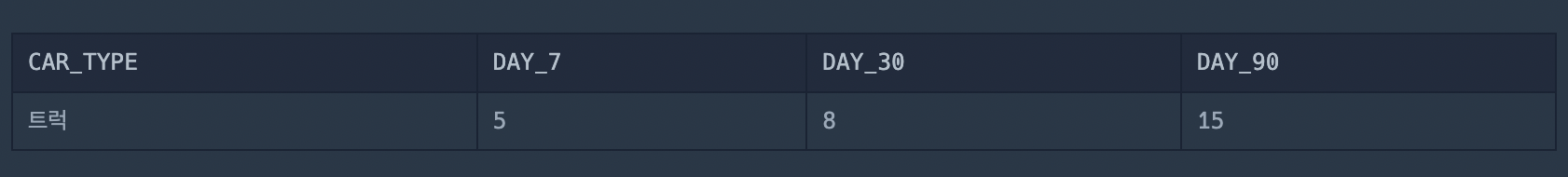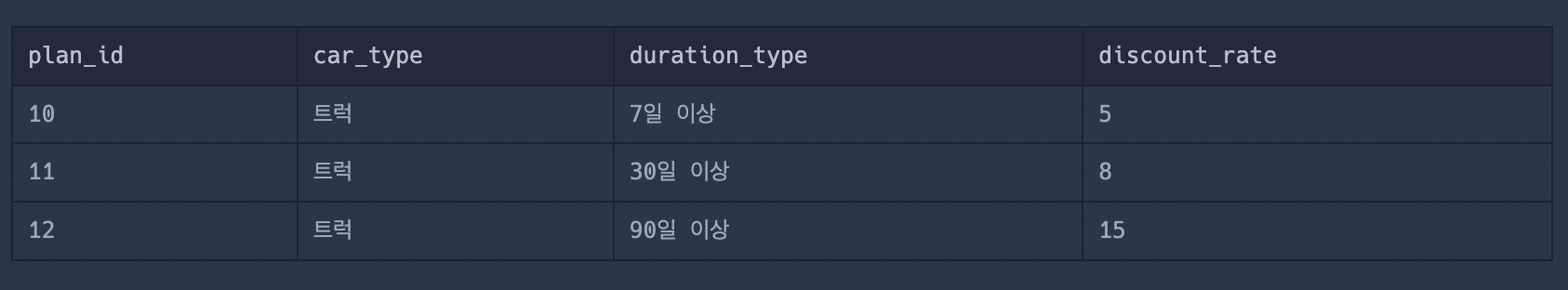 일단 CAR_RENTAL_COMPANY_DISCOUNT_PLAN의 '트럭'의 할인정책은 다음과 같다.