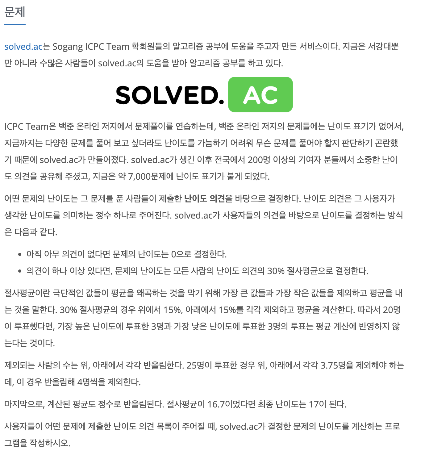 5명의 15%는 0.75명으로, 이를 반올림하면 1명이다. 따라서 solved.ac는 가장 높은 난이도 의견과 가장 낮은 난이도 의견을 하나씩 제외하고, {5, 5, 7}에 대한 평균으로 문제 난이도를 결정한다.