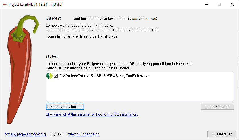 1. Specify location.. 을 눌러 IDE인 sts 가 설치된 경로를 찾아온다