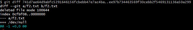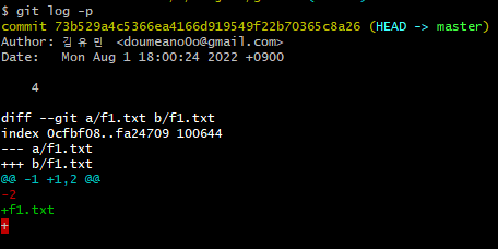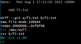 - --- 는 이전 버전, +++ 현재 버전을 뜻하는데, --- /dev/null +++ b/f2.txt은 파일이 없었는데 f2.txt 파일이새로 생성되었다는 뜻이다. 따라서, Add f2.txt 커밋에서는 f2.txt의 초기 내용이 2(초록 글씨)로 기록되었다.