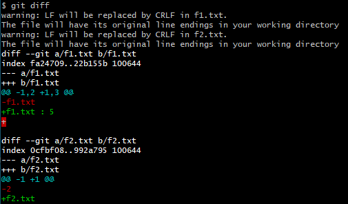 우선 vim을 통해 f1.txt 파일을 수정한 뒤 git diff 명령어를 수행하면,