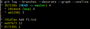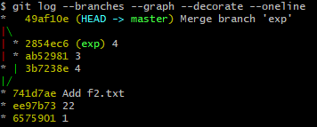 - 위의 로그에서는 master branch와 exp branch의 공통의 부모는 "Add f2.txt" commit이고, 3번 커밋부터 각각 다르다는 것을 알 수 있다.