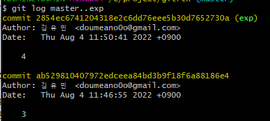 : master에는 없고 exp에 있는 commit 내역을 볼 수 있다.