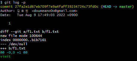 ✔ git log -p 명령을 통해 repository 에서의 f1.txt 내용을 확인해보자.