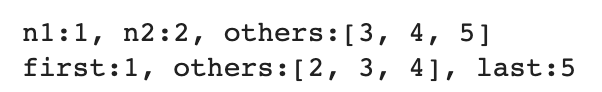 # 2의 경우는 *others 변수가 중앙에 있는 것을 볼 수 있는데, 처음과 마지막 값을 각각 first, last 변수에 저장하고, 맨 앞뒤 값을 제외한 중간의 값들을 리스트로 others 변수에 저장한다.