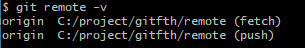 - 저장소에 origin 이란 이름으로 c:/project/gitfth/remote 원격저장소가 연결되어있음을 확인할 수 있다.