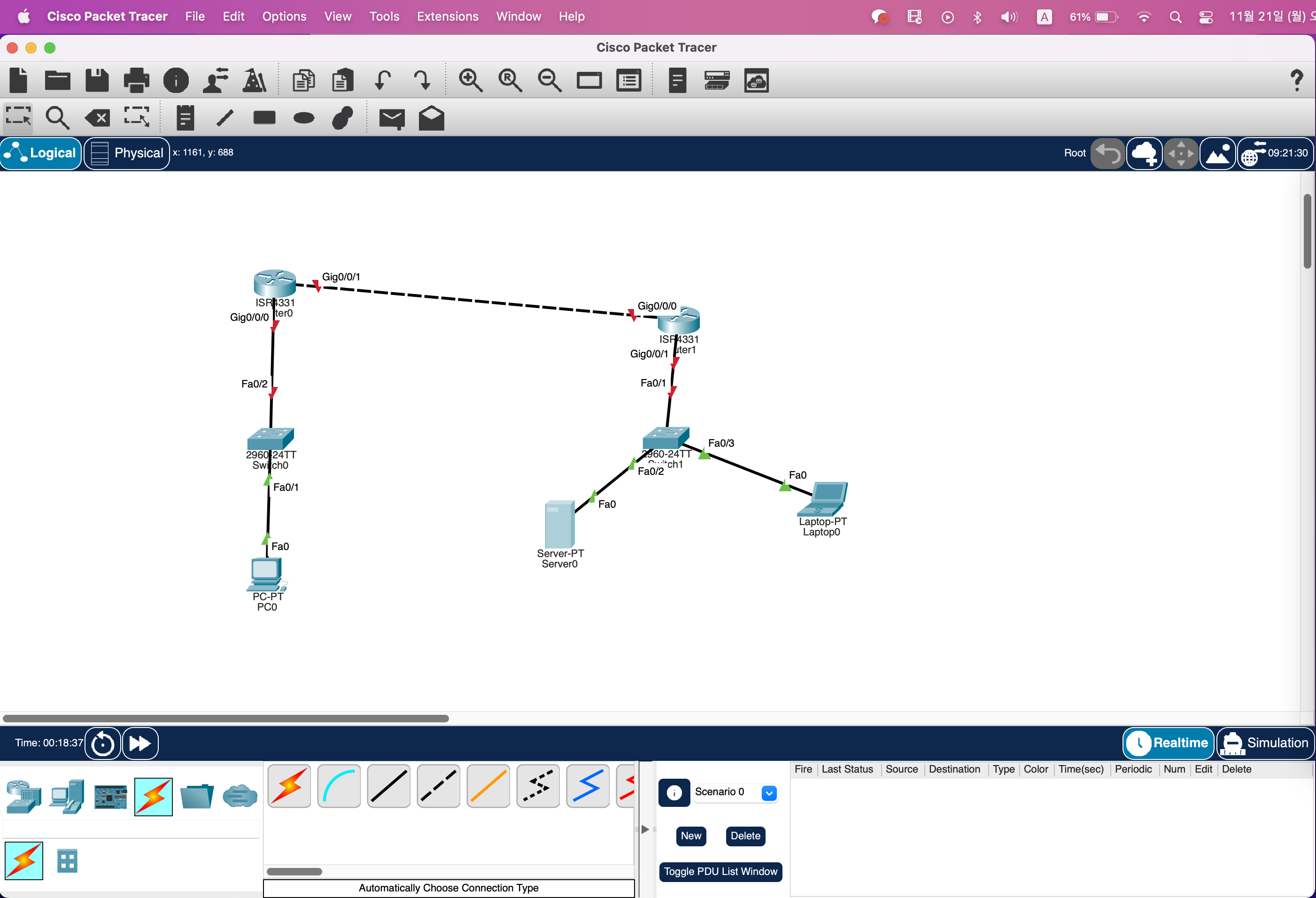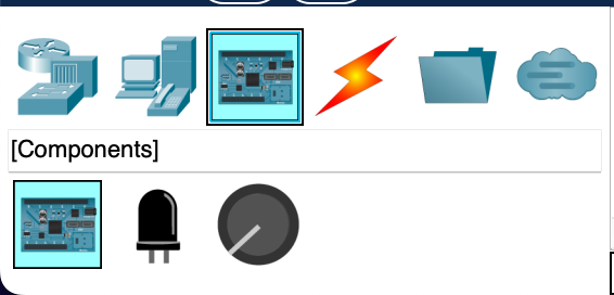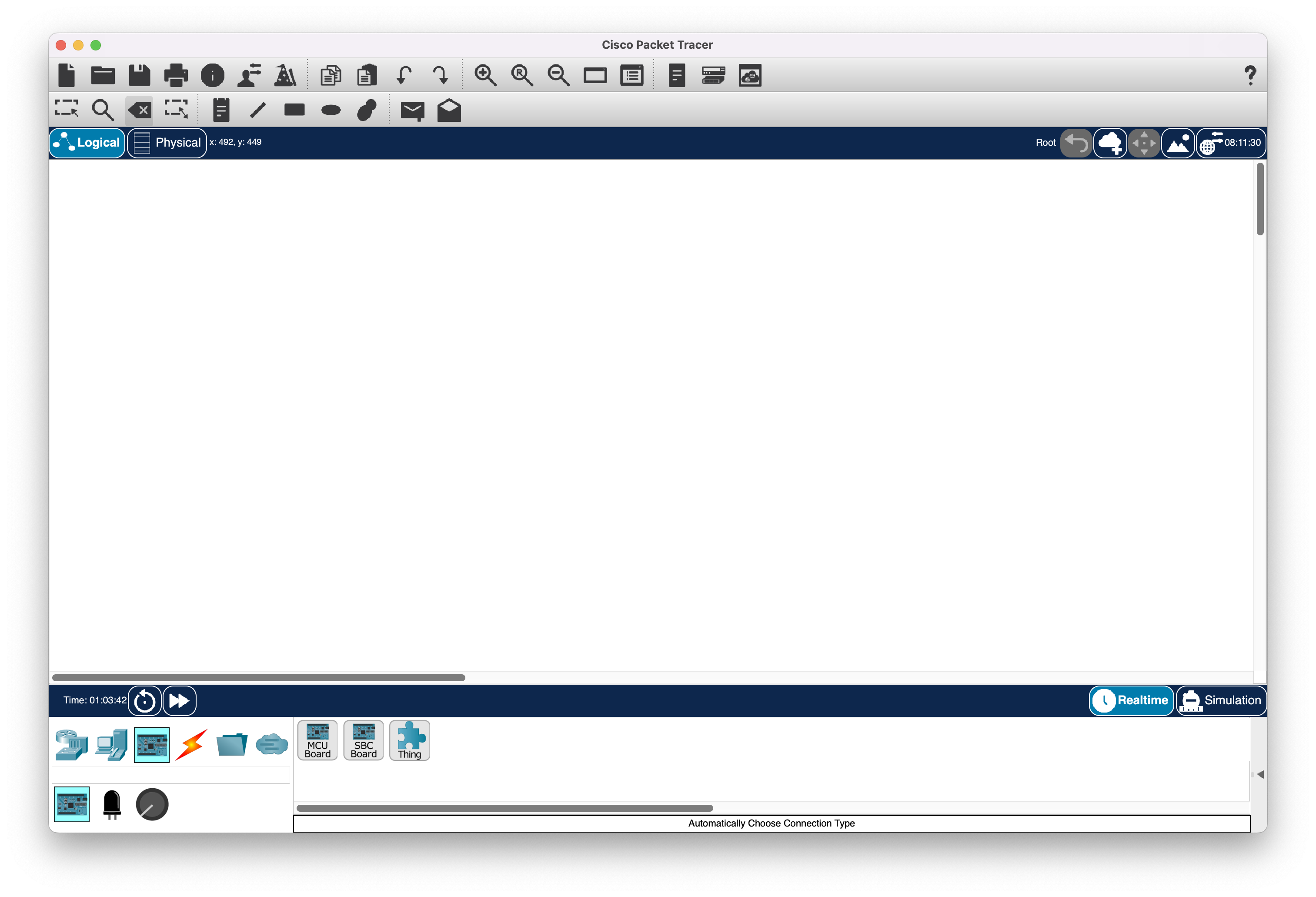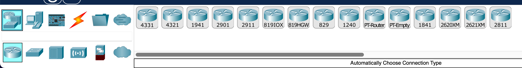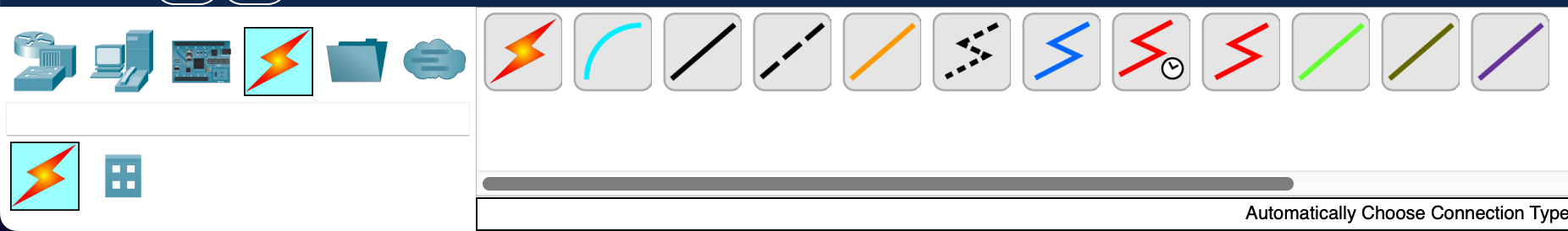 - 각 장비들을 하단 메뉴에서 선택해 작업 공간에 클릭만 해주면 배치할 수 있고, 링크는 [번개]모양으로 연결할 장비들을 클릭하여 연결하면 된다.