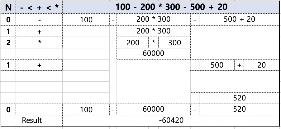 ('+', '-', '*') 라는 우선순위가 있다고 할 때, 뒤로 갈수록 우선순위 높아진다고 하면