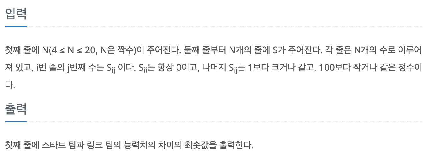 temp += s[i][j] + s[j][i] # a 팀에 속한 모든 사람들과의 능력치 계산