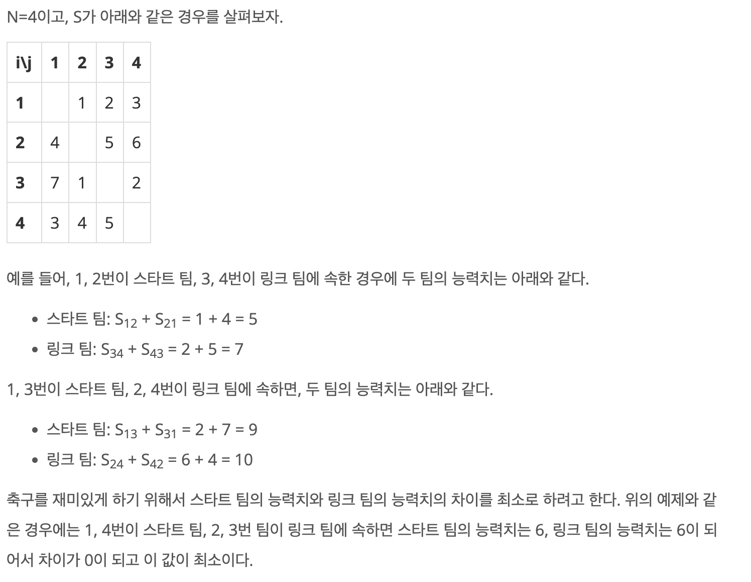 또, 팀원을 N/2 명으로 모두 나눴을때, B팀의 점수를 계산하기 위해서 n명을 다 탐색하면서 b_team 배열을 새로 만든 뒤 점수를 계산하기 때문에 소스가 복잡해진다.
