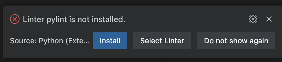 그럼 하단에 pylint 가 설치되어있지 않다며 설치할건지를 묻는다. Install을 눌러 설치해준다.