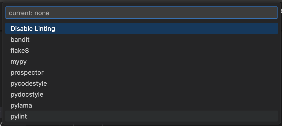 그러면 설정할 수 있는 python의 린터들 목록들이 나온다. 나는 그중 pylint 를 선택했다.