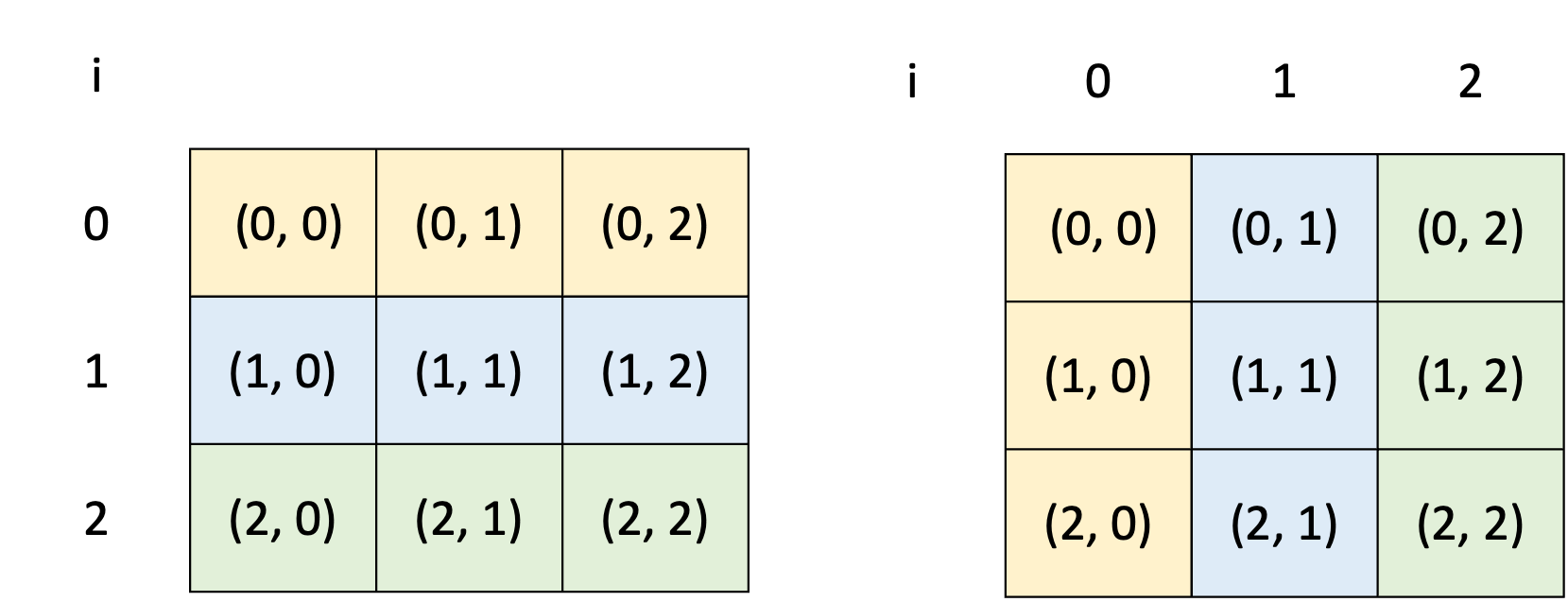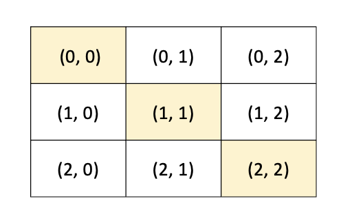 ① (0, 0) > (1, 1) > (2, 2) 으로 탐색하면 왼쪽에서 오른쪽 방향으로,