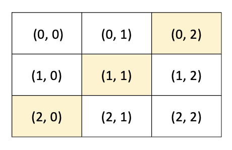 ② (0, 3) > (1, 1) > (2, 0) 으로 탐색하면 오른쪽에서 왼쪽 방향의 대각선으로 완성됐는지 확인할 수 있다.