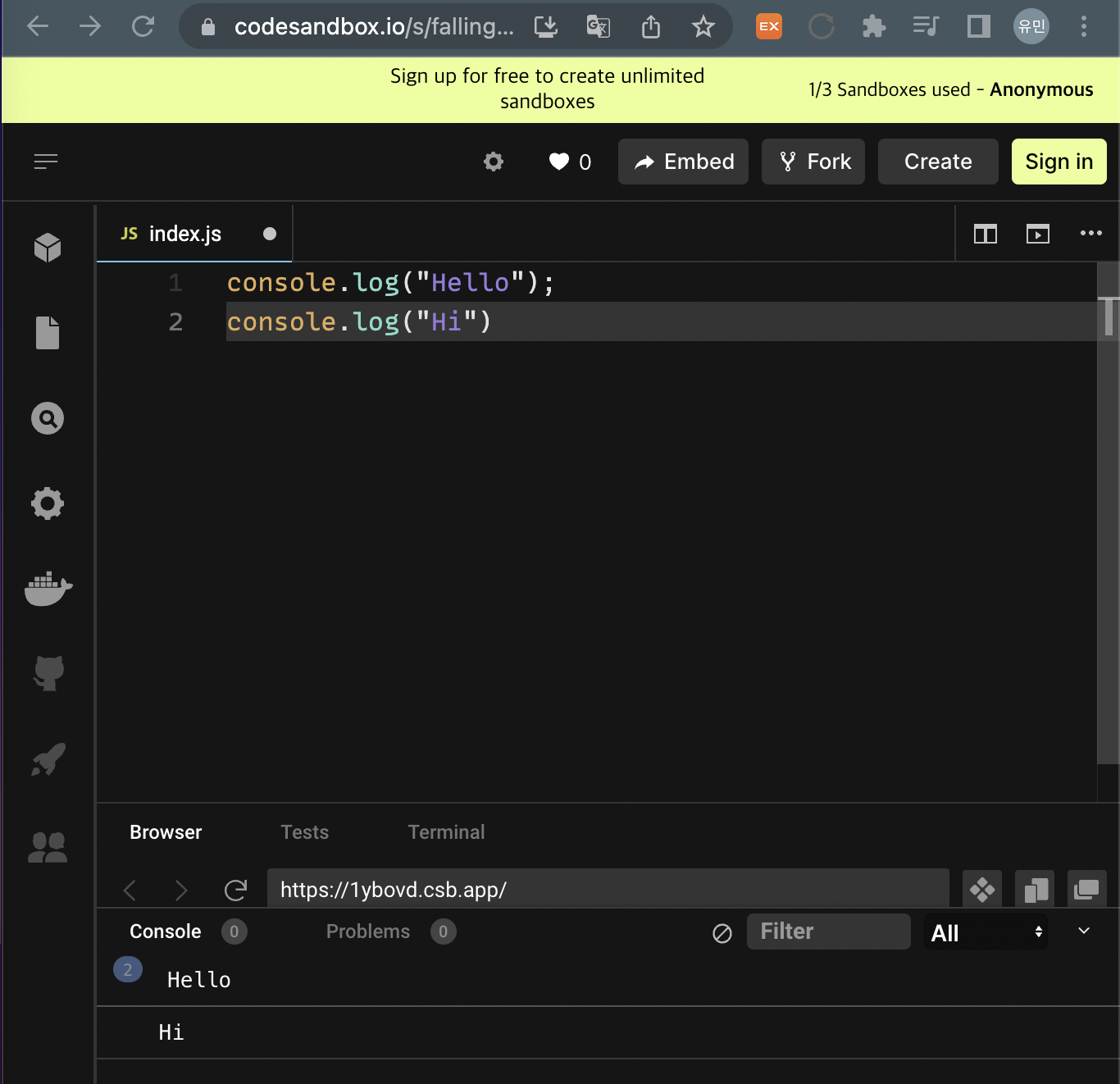 console.log("안녕! 자바스크립트"): 콘솔에 출력- CodeSandBox : 온라인 코드 에디터 > 수업 실습에 사용하는 에디터이다!