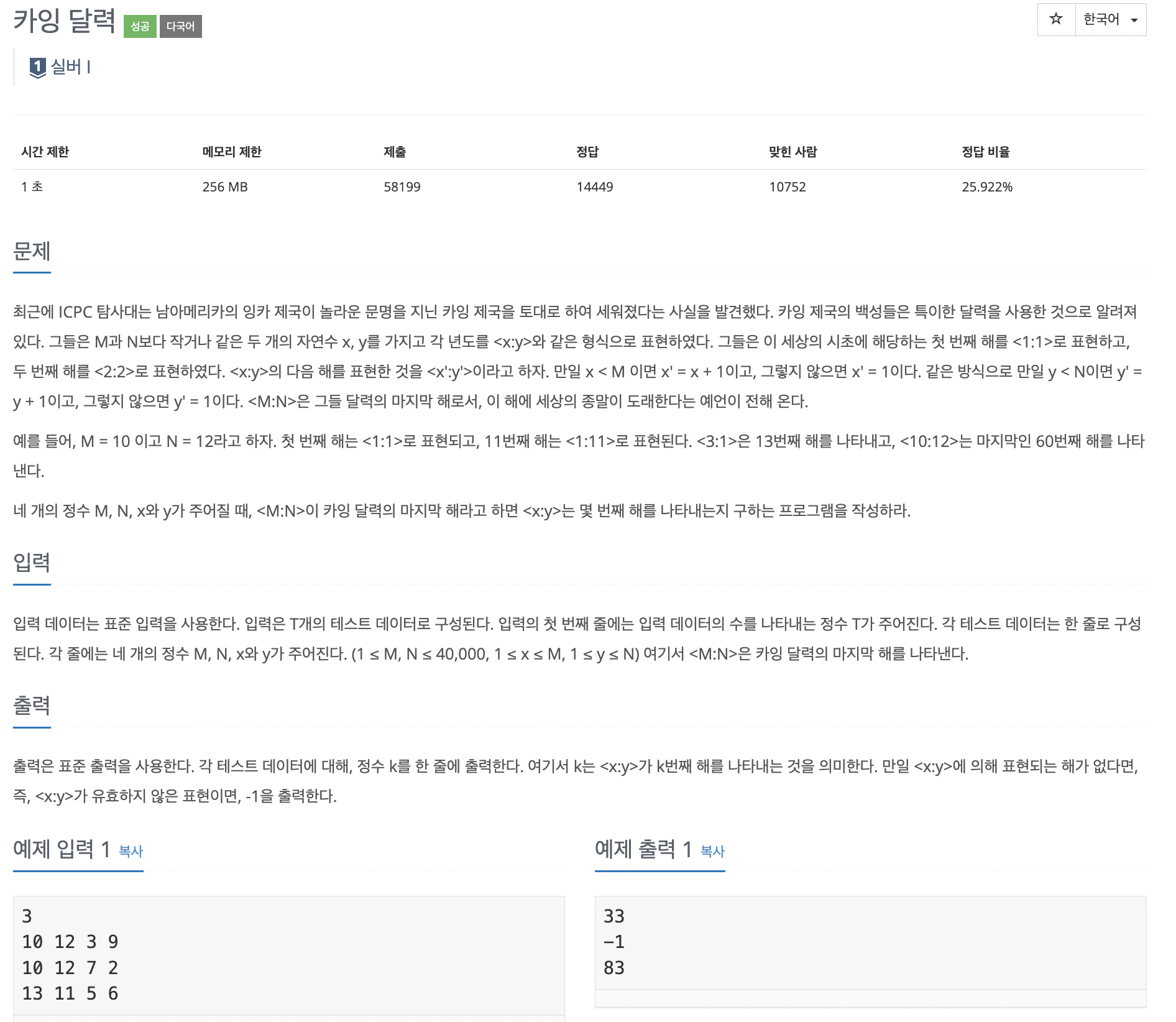 실버1 난이도의 문제인데 사실 너무 어려웠던 문제다. 멸망 해가 최소 공배수인건 알겠는데, <x:y>가 몇번째 해인지 구할 방법을 도저히 못찾았다. 풀이를 보고도 이해가 안돼서 손으로 하나하나 천천히 따라가다가 겨우 풀었다. 🫠