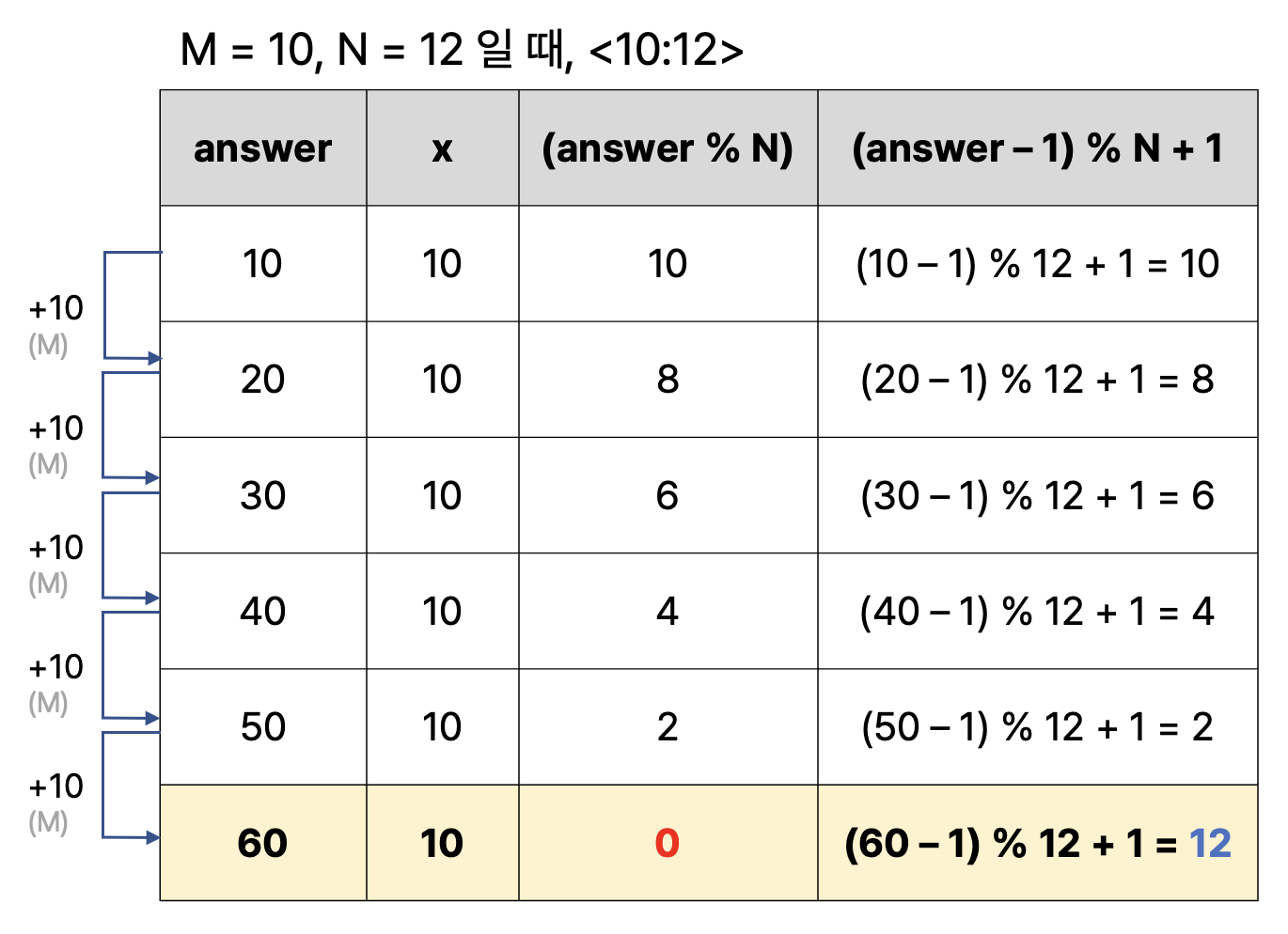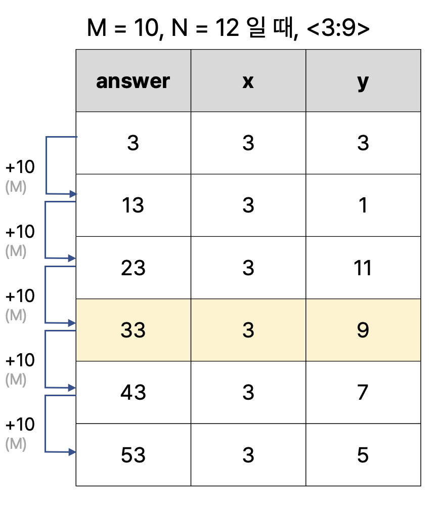 몇번째 해인지를 answer 변수에 담아서 x로 표현할 수 있는 가장 작은 년도인 x부터 M 씩 증가시킨다.
