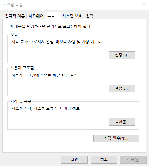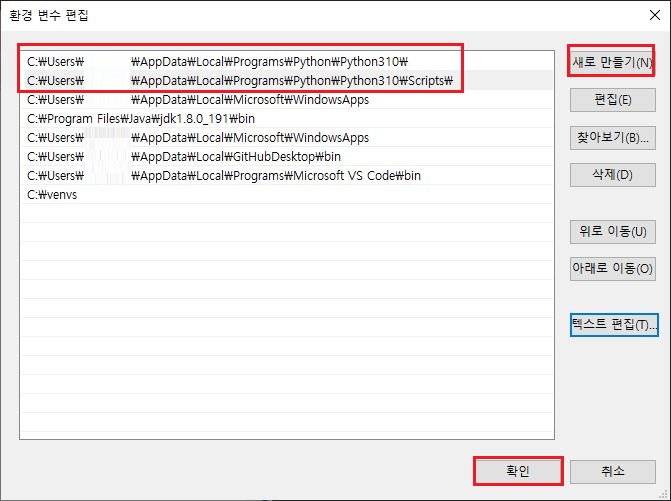 시스템 속성 > 고급 > 환경변수 > {User}에 대한 환경변수 > Path > 편집